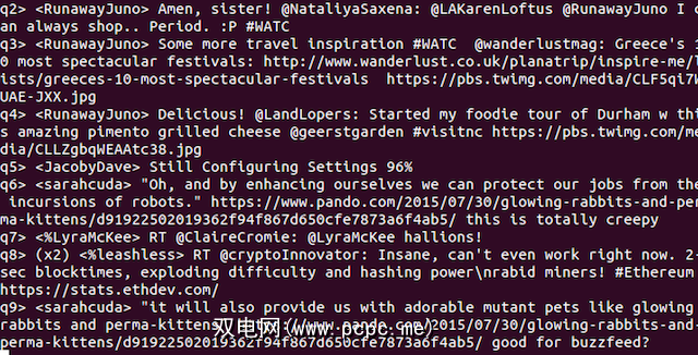RainbowStream由两个部分组成。第一个称为“流",它显示您的Twitter feed的内容。它以最令人着迷的方式做到了,我发现自己盯着我的电脑屏幕近10分钟,看着推特过去后一直在推特。