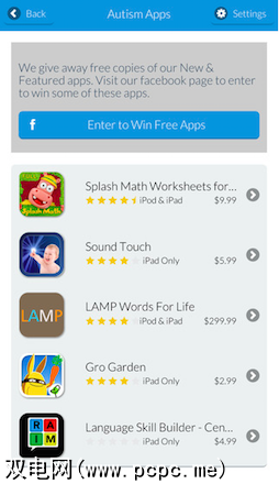 实际上,我对缺乏自闭症应用感到失望。对于iOS,我能找到的最好的应用程序列出了其他应用程序。这些应用程序有助于教授自闭症患者的语言技能和社交技能。