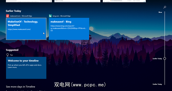 任务视图还可以让您访问Windows 10的时间轴功能。这提供了您最近完成的所有操作的历史记录,因此您可以轻松地跳回上一个任务。