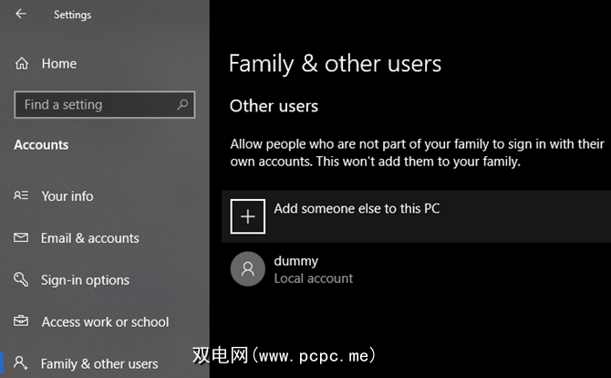 要创建新的用户帐户,请打开“设置"应用程序( Windows + I ),然后导航至帐户 >>家庭和其他用户。在其他用户部分下,选择向此PC添加其他人。