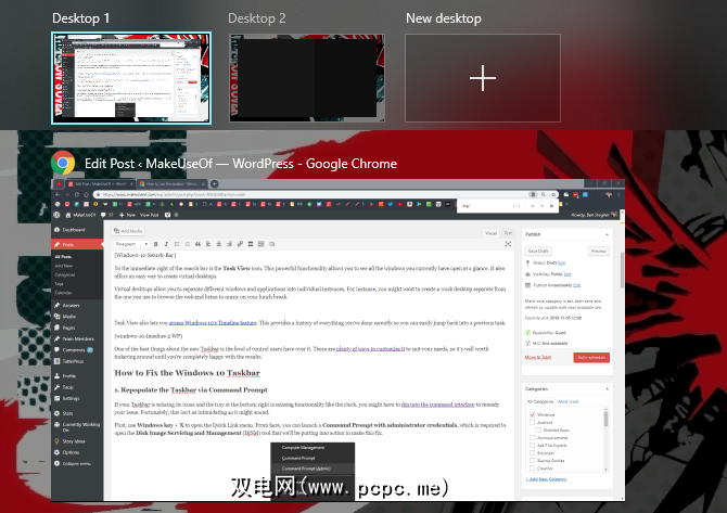 在搜索栏的最右边是任务视图图标。这项强大的功能使您可以一目了然地查看当前打开的所有窗口。它还提供了一种创建虚拟桌面的简便方法。
