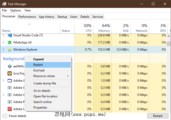 要重新开始此过程,请按 Ctrl + Shift + Esc 启动任务管理器。如果仅看到简单的窗口,请点击底部的更多详细信息。然后在进程选项卡上,找到 Windows资源管理器。右键单击它,然后选择重新启动。