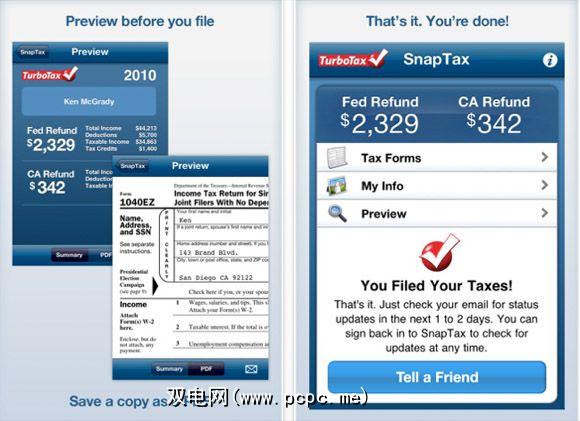 TurboTaxSnapTax是一个免费的税务准备应用程序,您可以使用它来估算您的收益或所欠的金额。但是使用该服务电子提交表单的费用为14.99美元。此应用程序适用于提交1040-EZ表格的人员,以及符合以下条件的人员:收入80,000美元或以下(如果结婚,则为10万美元),仅来自W-2族的收入,或失业,无受抚养人,无住所或房地产所有权。