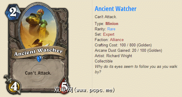 因为这张卡无法攻击,所以除了变成嘲讽之外,它还没用吗?错误!古代守望者可能会受到沉默的影响,因此无法攻击。始终谨记Battlecry特效,因为其中许多特效都可以用来攻击棋盘上的卡。