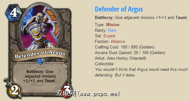 上面的纸牌是游戏中最强大的中性牌之一,尤其是在竞技场模式下起草一副纸牌时。如果您顶住了Argus的Defender防御者,而您的仆从却以尴尬的姿势放在板上,那么您将被迫向不愿使用的仆从上投掷嘲讽,或者根本不使用该卡。