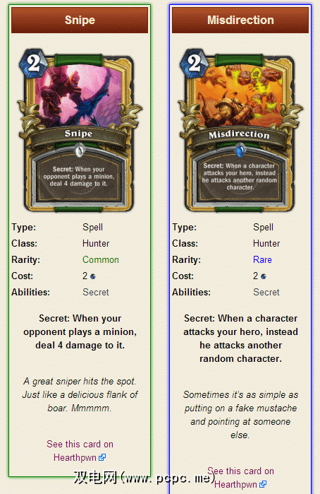 上面显示的是两个特别的Secret猎人套牌中的这张牌很好地捍卫了这一规则。想象一下,如果您可以玩银色大地鼠(使用神圣盾牌的1/1),可以在“狙击"秘密中玩Azure Drake(4/4卡)。想象一下,当您使用9/5 Core Hound进行攻击时要面对误导!一点都不好。