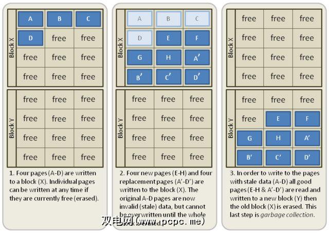 由于SSD的设计方式,不是可能会覆盖现有数据(在HDD中可能是)。相反,为了将新数据写入占用的块,必须首先擦除整个块。