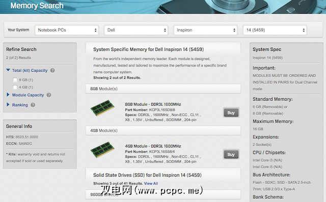您需要做的就是选择笔记本电脑制造商和型号,并且该工具将向您显示兼容的RAM列表和SSD。除了可接受的RAM或SSD的规格外,您还将发现笔记本电脑有多少个DIMM扩展槽,以及它可以支持多少最大内存。