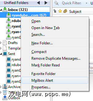 另一个非常酷的附件是一个称为“邮箱警报"的附件。就像您的手机一样,您可以使用邮箱警报为不同的呼叫者分配不同的铃声,实际上,您可以根据接收到传入消息的帐户来设置不同的警报和通知设置。安装插件后,只需右键单击帐户文件夹并选择“ 邮箱警报"。