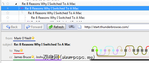 使用ThreadVis插件,您将获得有史以来最酷的线程可视化工具之一。现在,就像在Gmail上一样,您将看到电子邮件会话被组织为主题线程,但最重要的是,实际上,主题时间线以有趣的颜色编码视觉显示方式显示,时间轴上的每个发件人均按颜色标识。