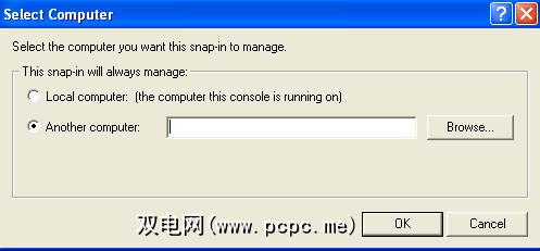 在另一台计算机(不一定是Windows XP,但一定是Windows计算机)上,在“计算机管理"窗口中,右键单击计算机管理(本地) 。选择连接到另一台计算机,然后选择另一台计算机。