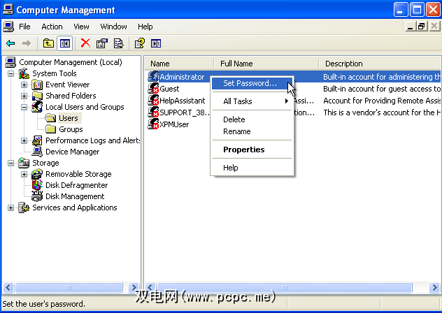 然后,选择系统工具>本地用户和组>用户。找到您的用户帐户,单击鼠标右键,然后选择设置密码。
