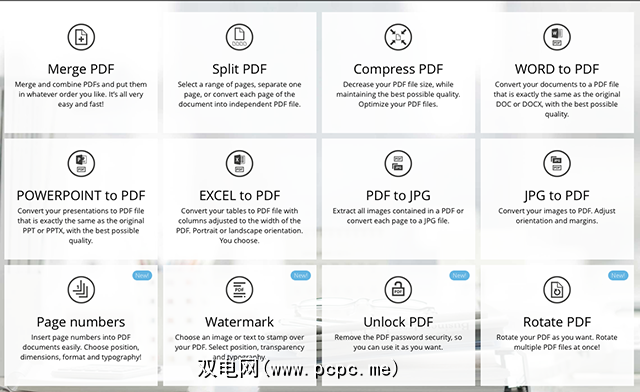 还有一些用于向PDF添加水印和页码的工具,如果需要缩小PDF文件,还可以使用compress选项。在此站点上加书签,Small PDF为您提供了一个非常完善的PDF转换工具包,其中包含一些编辑工具,因此请牢记两者。