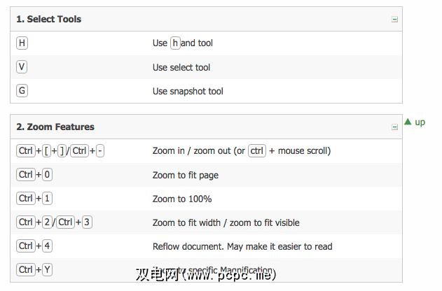 这正是您所期望的:用户收集的一组键盘快捷方式。它的范围不完全是Wikipedian,在这里可以找到很多很棒的键盘快捷键。快速浏览一下Adobe Reader的页面: