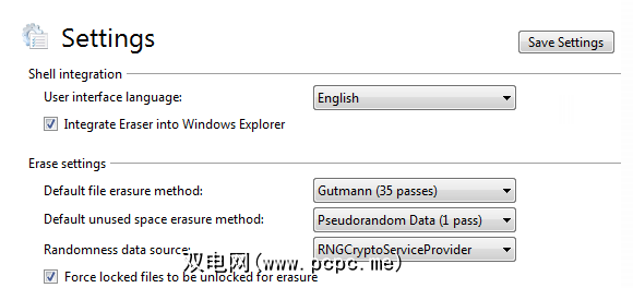 橡皮擦比CCleaner的Drive Wiper更方便,因为它可以删除和粉碎单个文件,而不仅仅是擦除驱动器上的所有可用空间,并且与Windows资源管理器集成(右键菜单)。此外,Eraser还为您提供了一系列高级设置,例如不同的文件和空间擦除方法,将擦除的文件替换为其他文件以实现合理的“可否认性"的选项,以及计划擦除文件,文件夹,回收站或未使用的文件