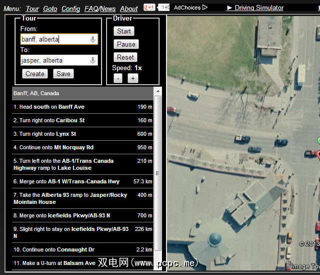 此工具是GMaps示例项目。在左下方输入一条路线,点击路线,右侧会显示路线,并且(如果有),您可以点击底部的 Drive 来浏览该路线的Google街景图像,将显示在顶部。您可以将缩时摄影带入全屏,并在车辆前进时平移和缩放。