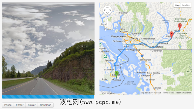 此工具可将Google的全景街景数据拼接成GIF短片。在页面顶部,您可以输入旅程的开始和结束位置。当您单击播放时,该路线会在右侧地图上标记出来,图像会加载并在左侧开始播放。如果有其他路线可用,则可以从地图下方的表格中选择。您可以控制间隔拍摄的速度并暂停播放。如果您欣赏美景,可以将图像下载为动画电影。