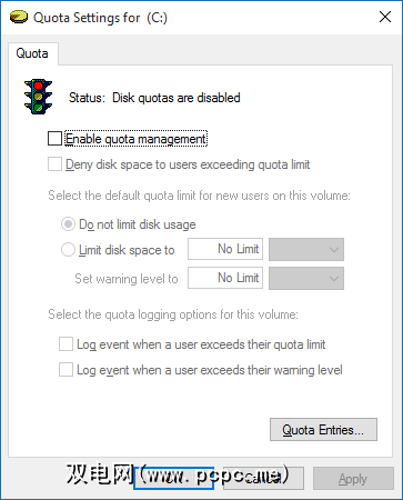 访问配额设置,请先在此计算机下查看您的驱动器。然后右键单击要为其设置配额的驱动器,然后单击属性。您会注意到,此处的许多标签都带有现代图标-请记住这一点。现在,选择配额标签,然后点击显示配额设置。系统会为您显示“配额设置"窗口,并带有一个可爱的复古交通信号灯图标。