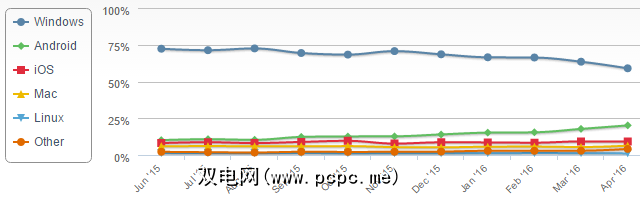 Windows用户可以选择。当需要购买新设备时,Mac,Chromebook和Android设备很有吸引力。同时,Linux在Windows硬件上运行。毫不奇怪,全球Windows市场份额已从2015年6月的72.3%下降到今年4月的59%。