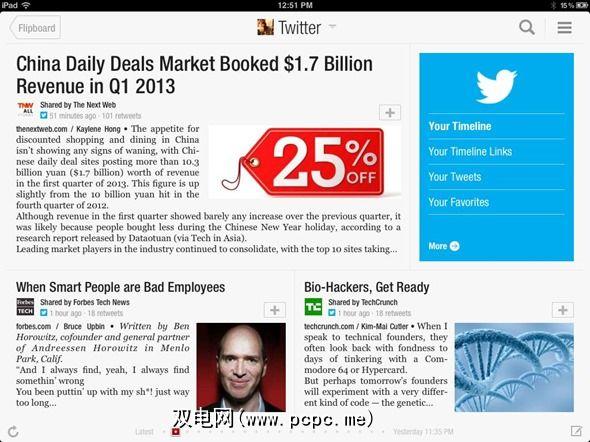 使用Flipboard,您还可以查看自己的推文,收藏夹,列表,仅包含链接,您的提及等的推文。它甚至还充当Twitter的各种客户端,使您可以回复推文,转发,关注用户,使用户静音,以及在其他网络(如Facebook和Google+上)或通过电子邮件共享文章和iMessage。 Flipboard的所有其他其他功能(例如稍后保存)可在您的Twitter文章中使用,当然,您也可以享受Flipboard着名的梦幻般的界面。