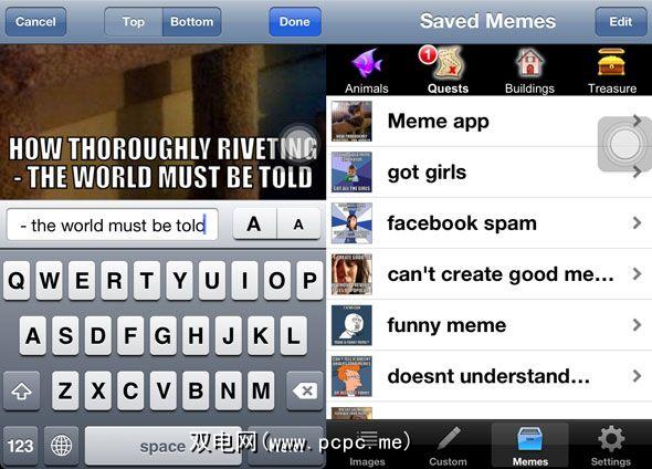 我之前谈到过OSX版本-iPhone应用程序也是免费的(尽管受广告支持),而且共享选项也有所限制-您只能通过电子邮件,鸣叫,或发送至Facebook。虽然是模因创作,但它是有效的–选择基本模因或上传自定义照片,编辑顶部和底部文本,更改大小–您还需要什么?