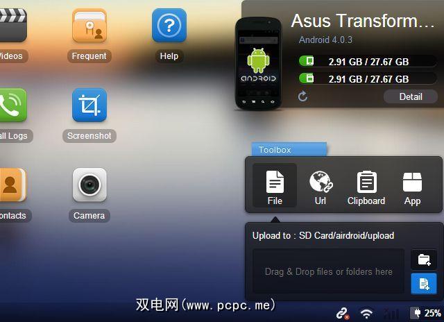 Airdroid屏幕的右侧使您可以访问当前的手机诸如内存使用,电池使用,网络状态等统计信息。您还可以访问剪贴板内容,Web浏览器等。