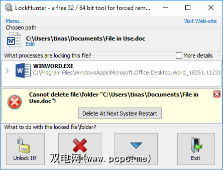 LockHunter会将其自身添加到Windows上下文菜单中。安装后,只需右键单击锁定的文件并选择什么是锁定此文件?。这将打开一个窗口,显示使用该文件的所有进程。现在,您可以选择解锁,删除(在下次系统重启时)或解锁并重命名。在我们的情况下,我们无法解锁文件,但是在下次系统重新启动时删除了文件。
