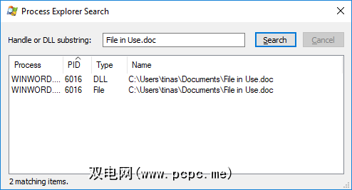 Process Explorer是功能更强大的File Explorer。它不仅列出了所有正在运行的进程,还可以显示哪个进程将您的文件作为人质。只需通过查找>查找句柄或DLL (或按 Ctrl + F )打开Process Explorer搜索,输入文件名,然后等待访问文件的进程列表。