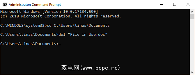 输入此命令以删除文件,将引号之间的所有内容替换为您的实际文件名: del“ File in Use.doc"