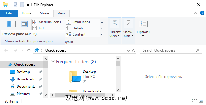 按 Windows + E ,切换到查看标签,然后按 Alt + P 关闭预览窗格。下面的屏幕快照在右侧显示了一个打开的预览窗格。