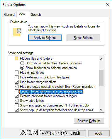 在“文件夹选项"窗口中,切换到查看标签并找到在单独的过程中启动文件夹窗口选项。确保未选中未。单击应用以保存所有更改。