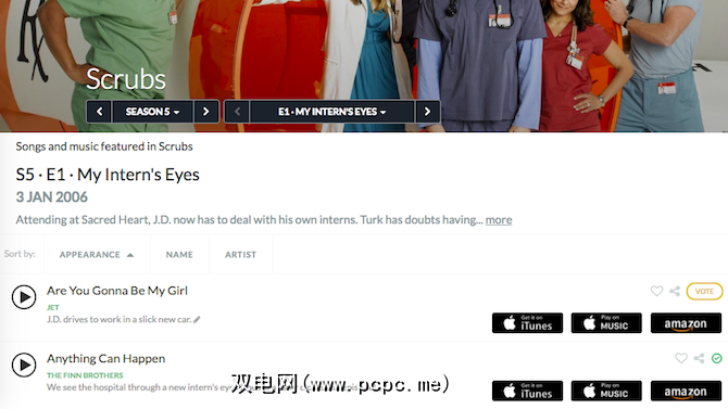 TuneFind可用于电影和电视节目,但在电视节目中尤其出色。例如,以 Scrubs 为例,该节目以其出色的配乐和歌曲使用而闻名。 TuneFind列出了每个季节,每个情节的歌曲,甚至描述了场景!因此,您每次都能找到正确的歌曲。