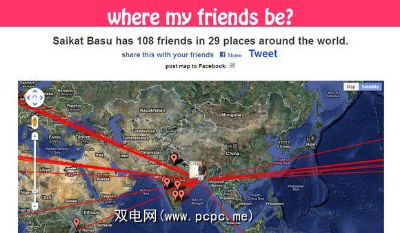 我的朋友在哪里是Google地图上的网络显示要简单得多。该应用程序会抓取您的个人资料照片,并将您在Google Map上定位。 Google地方标记和红色直线标出了您与朋友在Facebook上的位置关系。映射速度非常快,几秒钟内您就可以在地图上可视化整个朋友网络。如果选择此选项,则朋友地图会发布在您的个人资料上。