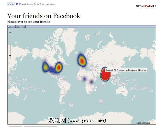 授予此应用权限以提取根据来自Facebook的数据,并在几秒钟内,地图显示了一个热图,您的朋友们在那里集中。鲜红色用于数量较多的区域。黄色和蓝色表示浓度较低。您可以放大到地图上更精确的位置。将鼠标悬停在热图上可以看到名称弹出;这些都可以单击到其个人资料。该地图似乎并不完全准确,因为它错过了我在澳大利亚的朋友圈。