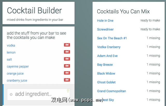 Cocktail Builder是一个出色的网站,可以在台式机和移动设备上完美运行。添加您拥有的成分,例如不同的酒精,柠檬,盐,咖啡,苏打水以及您手头上的其他任何东西。该网站将迅速向您展示您可以制作的所有鸡尾酒,以及使用一种或两种以上成分制作的其他鸡尾酒。也经常检查这些项目,因为您可能经常有这些项目,但您只是没有列出它们。