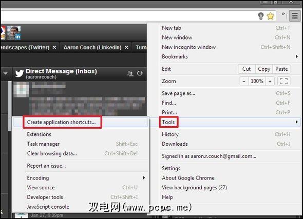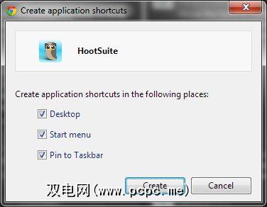另一个选项是登录到HootSuite后,转到“设置"下拉菜单(如上所示),将鼠标悬停在“工具"上然后单击“创建应用程序快捷方式"。然后选择您要放置快捷方式的位置(如下所示)。这并没有安装任何东西,而只是在桌面上放置了一个链接。