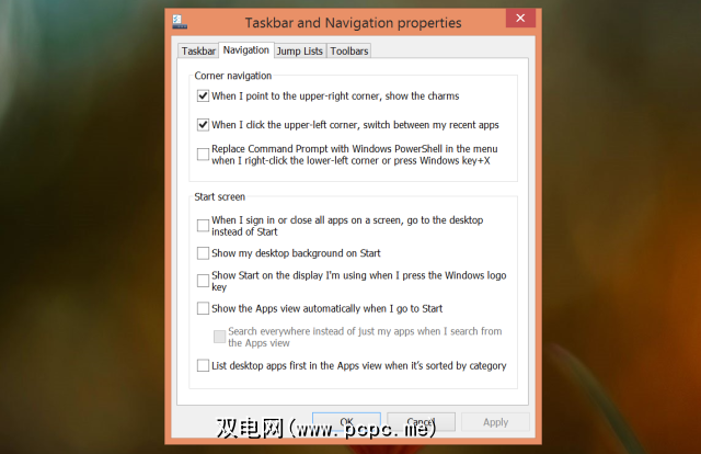 当然,如果这些手势中有任何一个妨碍您的操作(例如,可能是您误激活了触控板边缘手势),则可以禁用Windows 8的许多手势。请注意,Windows 8.1还允许您从任务栏的属性窗口禁用左上角和右上角热角。