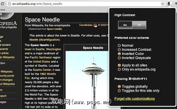 Google Chrome 用户可以使用Google的官方辅助功能扩展:高对比度。与Firefox插件类似,您可以使用扩展按钮或键盘快捷键(C md + Shift + F11 )切换颜色反转。此扩展程序的一大优点是,您可以为每个网站更改首选的配色方案。这样,您不必在每次访问已经提供夜间阅读模式的稀有网站时都切换颜色。