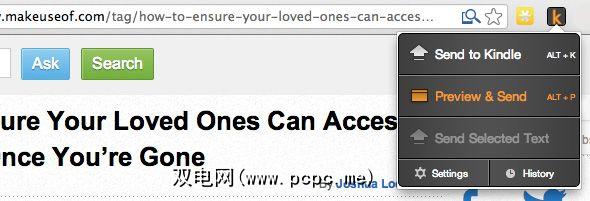 尽管Pocket与许多设备(包括Kindle Fire)很好地集成在一起,但是与电子阅读器。您可以使用另一个浏览器扩展程序弥合该特定差距。官方的Send To Kindle扩展程序涵盖了您。它们与Chrome(如下图)和Firefox等浏览器绑定,但是您还可以下载Mac和Windows的桌面应用程序,并将本地文件推送到您的电子书阅读器。