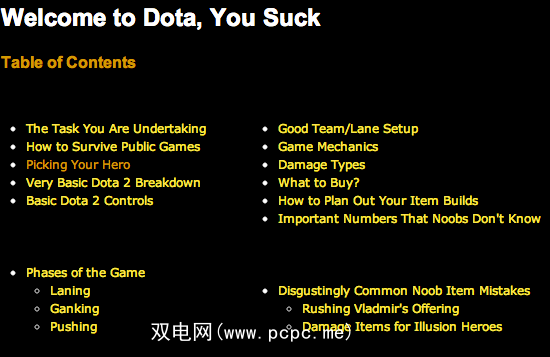 我已经之前曾谈论过Purges流,但是他的Dota 2网站还是Dota 2信息的绝佳资源。我特别喜欢他的巨著《欢迎来到Dota,请吸》。这部史诗般的文章几乎涵盖了游戏的各个方面,我建议所有新玩家都要花时间阅读。这绝不是一篇简短的文章,但是其中包含的知识使我们值得花时间坐下来并进行研究。