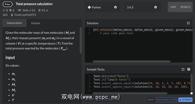 CodeWars并不是一个教程,因为它是一种测试您的编程知识的游戏方法。它由数百种不同的编码难题(称为“ katas")组成,它们迫使您利用从上述Python网站中学到的知识并将其应用于现实生活中的问题。