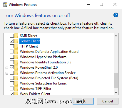 在Windows 10中,按< strong> Windows + Q ,键入 telnet ,然后选择从结果中打开或关闭Windows功能。向下滚动,直到看到 Telnet客户端条目,选中该框,然后单击确定。等待Windows完成请求的更改,然后单击关闭。