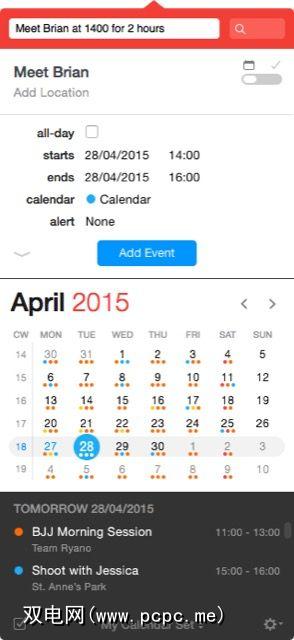 Fantastical最大的优点之一就是您可以用自然语言描述事件,并且该应用程序会解析您所说的内容并将其添加到日历中。例如,如果您输入“在1400与Brian见面2小时",Fantastical将从今天下午2点至下午4点创建一个名为“ Meet Brian"的事件。这是创建事件的一种好方法,比处理整个调查要好。