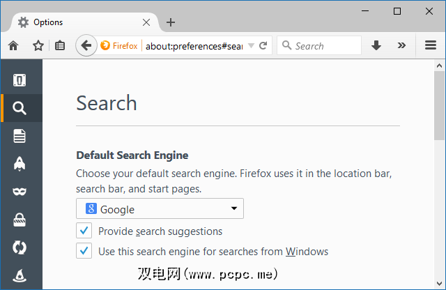当前,最简单的更改方法是在内部火狐浏览器。启动浏览器,然后在网址栏中返回关于:偏好设置。然后导航到左侧菜单上的搜索。在此屏幕上,您应该从下拉列表中选择首选的搜索引擎,然后勾选使用该搜索引擎进行Windows搜索。如果您是Chrome用户,请查看Chrometana应用程序以在Google,Yahoo和DuckDuckGo之间进行选择(尽管Firefox方法会为您提供更多选择)