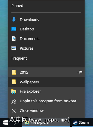 许多程序的跳转列表的共同特征是可以将快捷方式固定在顶部。在支持该功能的设备上,访问跳转列表,然后将鼠标悬停在您想要固定的内容上。然后,您要做的就是左键单击右侧的图钉图标,它将永久位于顶部。并非所有跳转列表都支持此功能,尽管跳转列表并不是Windows 10的新功能,但某些程序(如Spotify)实际上没有任何快捷方式。
