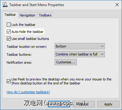 您的屏幕空间有限吗?您可能希望隐藏任务栏,以最大程度地利用您的可用空间。为此,右键单击任务栏,然后选择属性。现在,选中自动隐藏任务栏,然后单击确定。现在,您的任务栏将消失,并且仅在将光标移到屏幕底部时才会向上滑动。
