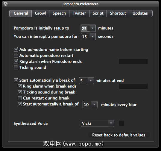 当我说Pomodoro非常强大时,我并不是在开玩笑。它可以自动重新启动计时器,在经过预设间隔后显示低吼通知,集成您的Twitter帐户并自动鸣叫pomodoro会话,并在会话开始,结束或之间的任何时间运行脚本。