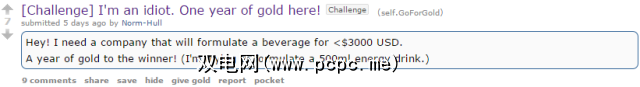 在/ r / GoForGold,用户发布挑战并奖励能够完成此任务的第一人。奖励是Reddit Gold的订阅。
