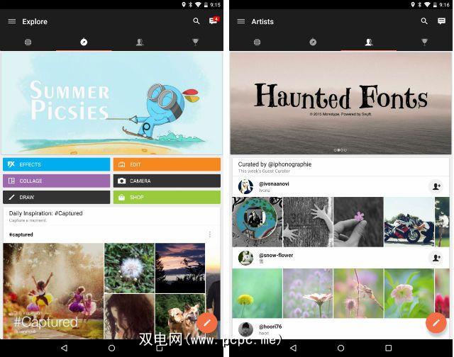 首次打开PicsArt Photo Studio时,感觉就像是连接了编辑器的社交网络。横幅和照片轰炸了您,您可以选择实际编辑隐藏在屏幕中间一个小按钮上的图像。该应用似乎主要集中在让您创建自己的网络,关注其他艺术家并在各种比赛中对最佳作品进行投票。
