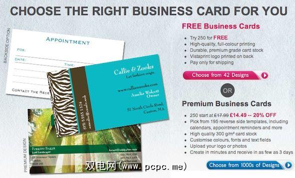 VistaPrint获得了一种专利方法,可以经济高效地进行小批量名片制作,从而使他们能够以非常便宜的价格提供名片(通常为250张名片价格为17.99英镑)。为了让您尝试一下,如果您是新客户,他们还免费提供250张卡片的打印运行(但您需要支付运输费用)。